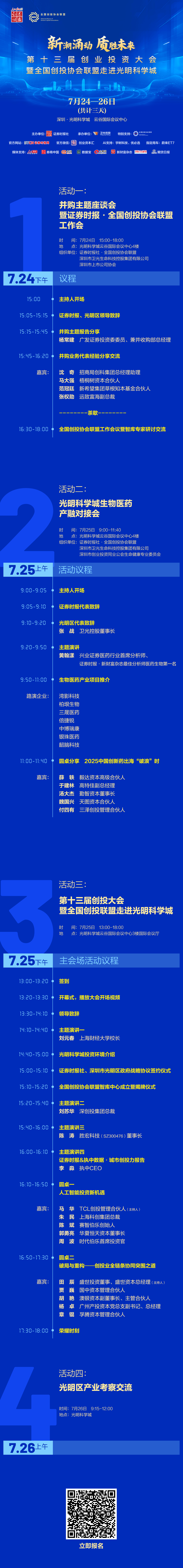 证券时报第十三届创业投资大会暨全国创投协会联盟走进光明科学城活动将于7月24日—26日正式拉开帷幕。本次活动为期三天,将汇聚中国创投界一众重磅嘉宾、举行多场隆重的揭牌和签约仪式,还有属于创投界的荣耀时刻即将璀璨揭晓。