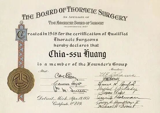 黄家驷被美国胸外科学专家委员会授予创始委员证书。