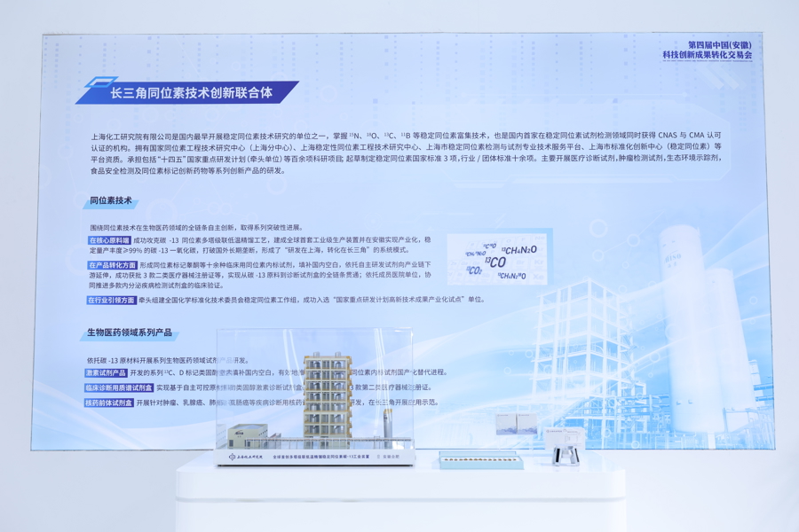 碳-13作为一种无放射性的稳定同位素,可安全用于临床诊断试剂以及呼气诊断试剂盒等领域,然而我国碳-13供应长期依赖进口。上海化工研究院此次展出了全球首个多塔级联低温精馏碳-13同位素工业装置模型。该院稳定同位素板块科研人员高慧敏介绍,上海化工研究院长期致力于国产稳定同位素产业化,去年成功建成年产100公斤、丰度99%以上的碳-13工业装置,打破了国外长期技术垄断,是继氮-15、氧-18等实现产业化后又一个稳定同位素规模化量产产品。